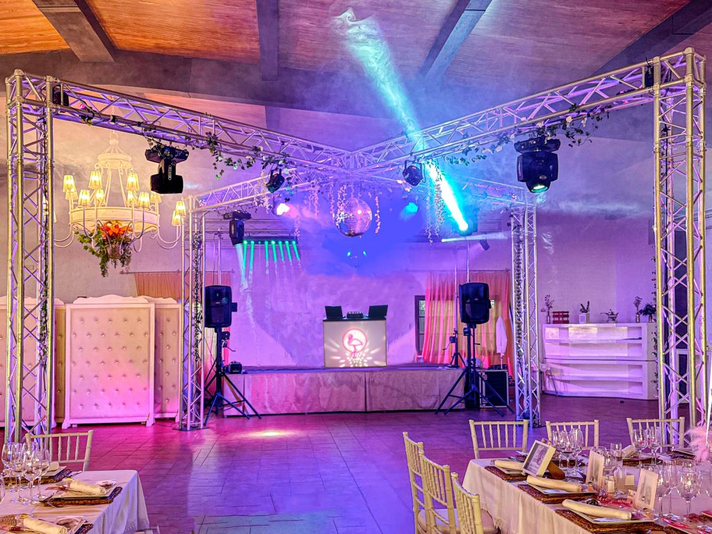 Puente de luces de cuatro metros + bola ochentera led + dos cabezas móviles + dos focos + máquina de humo.